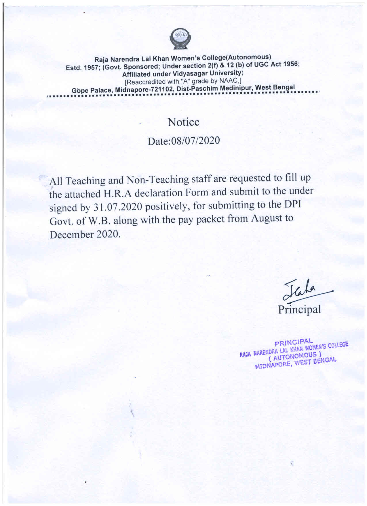 News : All Teaching and Non-Teaching staff are requested to fill up the attached H.R.A declaration Form and submit to the under signed by 31.07.2020 positively, for submitting to the DPI Govt. of W.B. along with the pay packet from August to December 2020. Requested to Submit 2 Copies of H.R.A declaration Form.