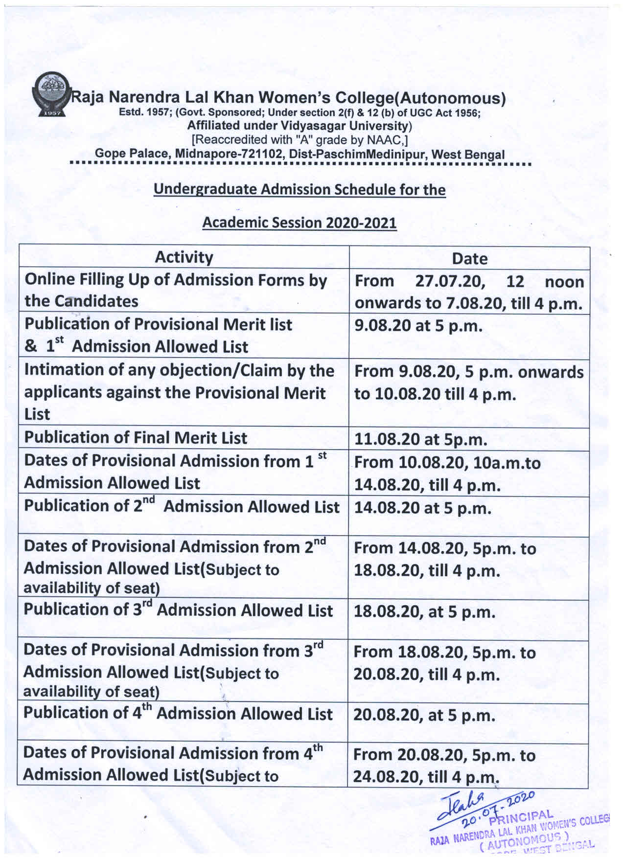 Undergraduate Admission Schedule for the Academic Session 2020-2021.
