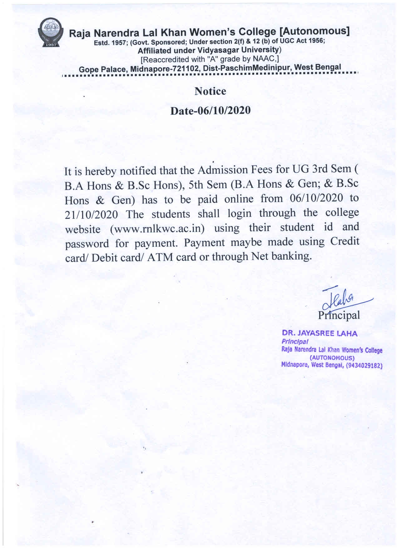 News : It is hereby notified that the Admission Fees for UG 3rd Sem ( B.A Hons &B.Sc Hons), 5th Sem (B.A Hons & Gen; &B.Sc Hons & Gen) has to be paid online from 06/10/2020 to 21/10/2020