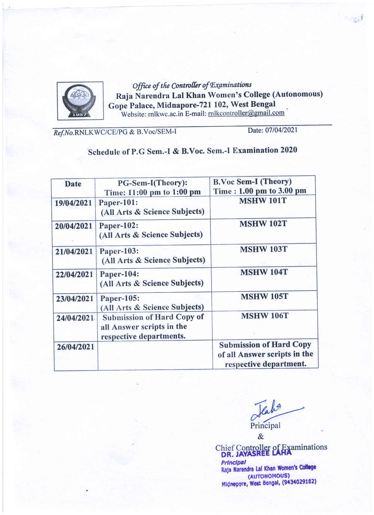 News : Examination Schedule of PG & B.VOC Semester –I, 2020.