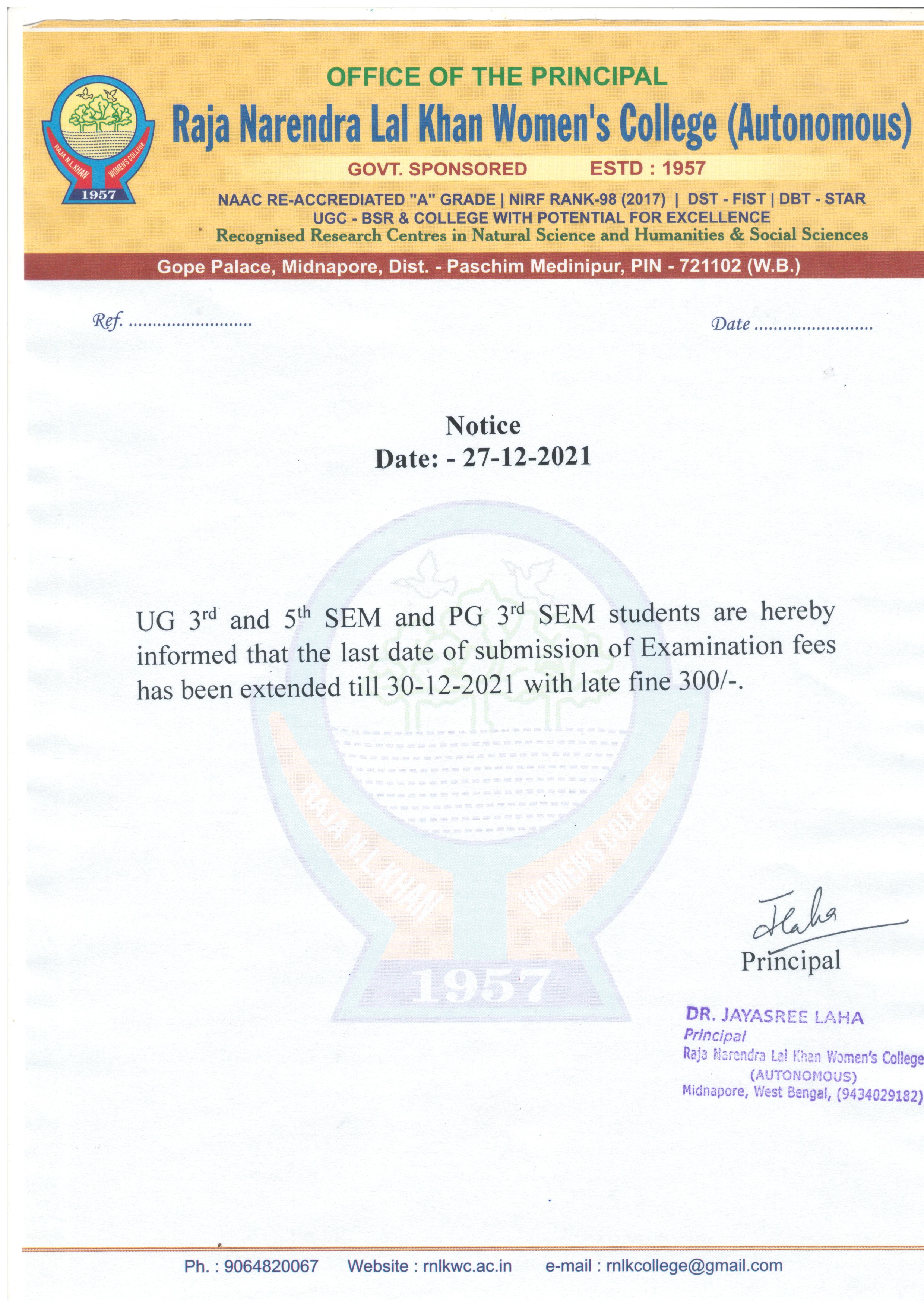 News : UG 3rd and 5th SEM and PG 3rd SEM students are hereby informed that the last date of submission of Examination fees has been extended till 30-12-2021 with late fine 300/-.